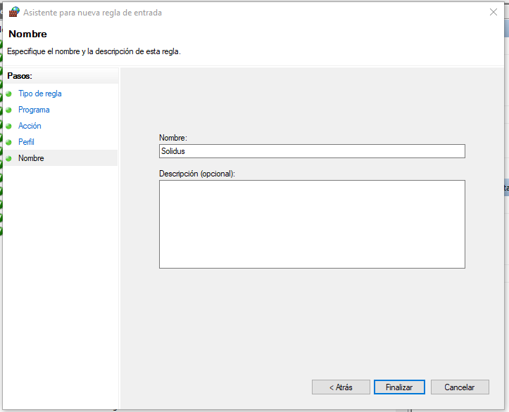 Agregamos el nombre de nuestro sistema segun sea el caso, en el ejemplo estamos trabajando son Solidus y damos clic en el botón Finalizar.