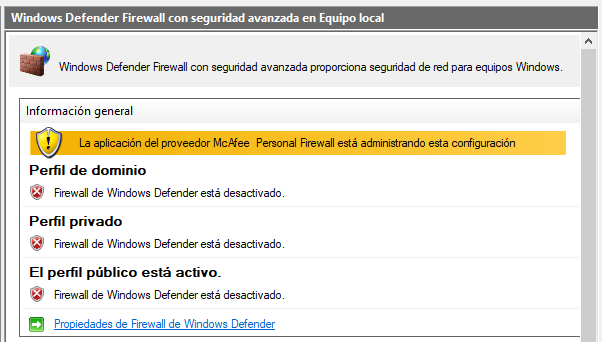 En la siguiente ventana damos clic en Propiedades de Firewall de windows defender.