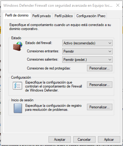 En la siguiente ventana, en la pestaña de Perfil de domino, vamos a la opción Estado del firewall, aqui debemos elegir la opción activo y conexiones entrantes elegimos la opción permitir, como se muestra a continuación y damos clic en aplicar.