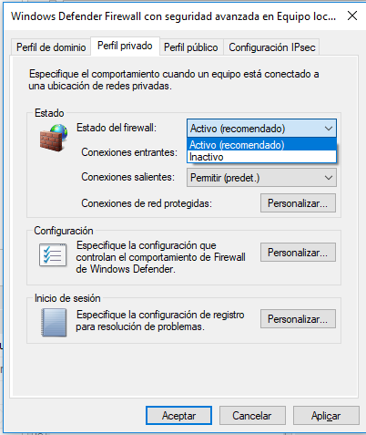En la pestaña de Perfil privado, vamos a la opción Estado del firewall, aqui debemos elegir la opción activo y conexiones entrantes elegimos la opción permitir, como se muestra a continuación, damos clic en el botón Aplicar y Aceptar