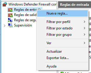 Ahora nos posicionamos en la opción Reglas de entrada y damos un clic, enseguida damos clic derecho con el mouse y elegimos la opción Nueva regla...