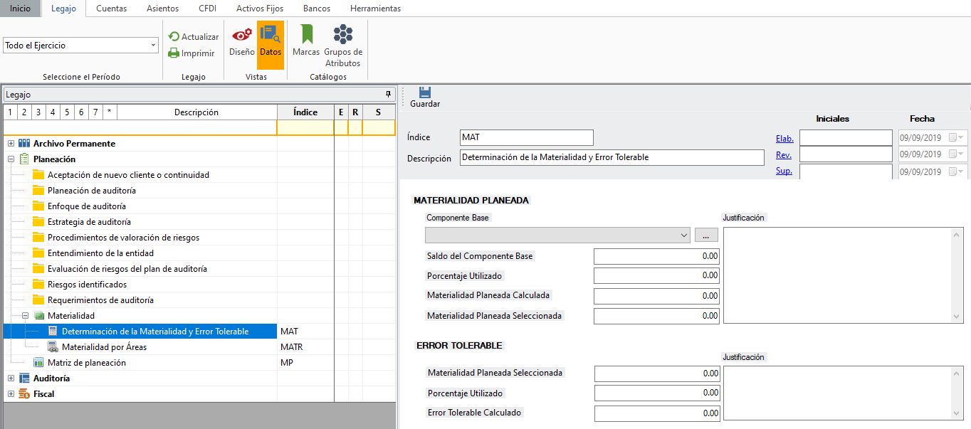 Dentro del "Legajo" da clic, en el signo +, en la carpeta "Planeación" y otro en "Materialidad", da un clic sobre "Determinación de la Materialidad y Error Tolerable", se presentará la configuración del lado derecho.