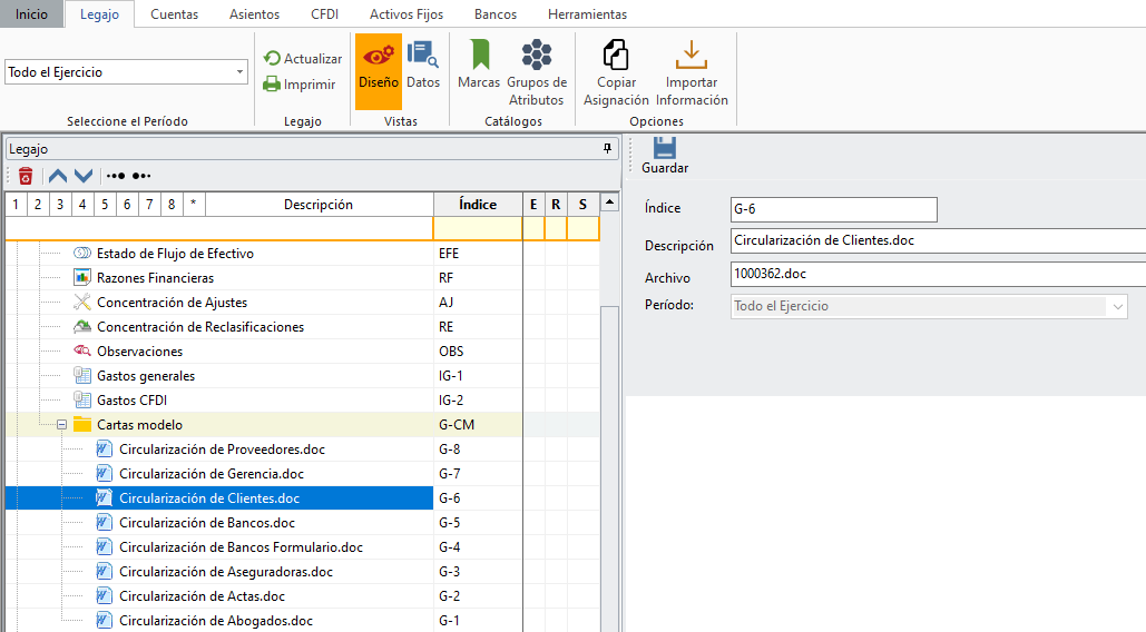 Las cartas que sirven de base para realizar la generación de documentos pueden estar ubicadas en cualquier parte del legajo. En el ejemplo que se muestra a continuación, se localizan en la carpeta "General" dentro de "Auditoría".