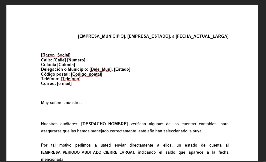 El tipo de archivo debe ser en el formato de Word. Los elementos que debe contener deberán ser los mismos que están en la tabla de datos que se desee usar para generar documentos. Por ejemplo, se observa en la siguiente imagen varios elementos entre corchetes, lo que se presenta en corchetes en mayúscula se toman del sistema, lo que está en minúsculas son los que debe contener la tabla de datos. Puedes configurar los elementos que desees en el formato de la carta modelo siempre y cuando sea el mismo de la tabla de datos.