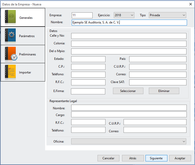 Se presentará una ventana con cuatro opciones: "Generales", "Parámetros", "Preliminares" e "Importar". En "Generales" captura todos los datos solicitados, lo más importante es ingresar correctamente el RFC de la empresa. Si vas a realizar la descarga de facturas electrónicas se necesitará la e.firma (para la descarga desde los servicios web del SAT) y la contraseña para acceso al portal (para la descarga desde la página del SAT). Para continuar da clic en "Siguiente".