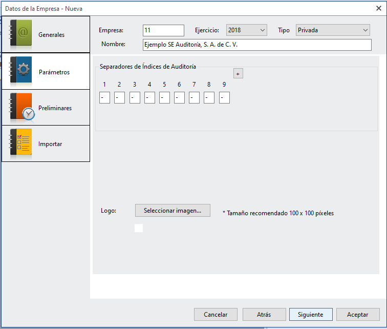 En "Parámetros", Separador de índices de auditoría, deberás colocar el caracter que se usará como separador de niveles. No es el índice de auditoría. En "Seleccionar imagen..." puedes subir el logotipo de la empresa para los reportes.
