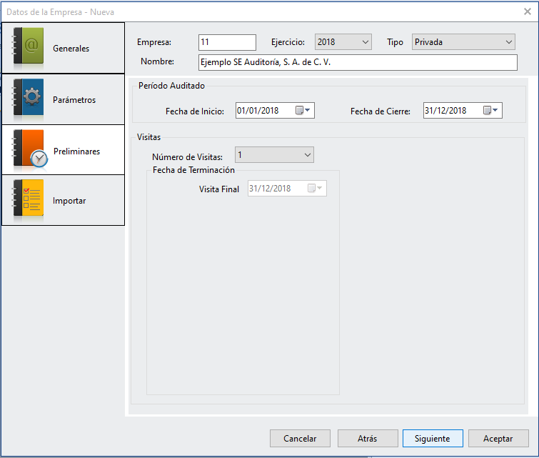 En "Preliminares", Periodo auditado, deberás indicar la fecha de inicio y la fecha de cierre del periodo a auditar. No debes confundir este periodo con las previas o preliminares. En Visitas, selecciona el número de visitas que tendrás en la revisión. Cuando no existe ninguna debes dejar 1.