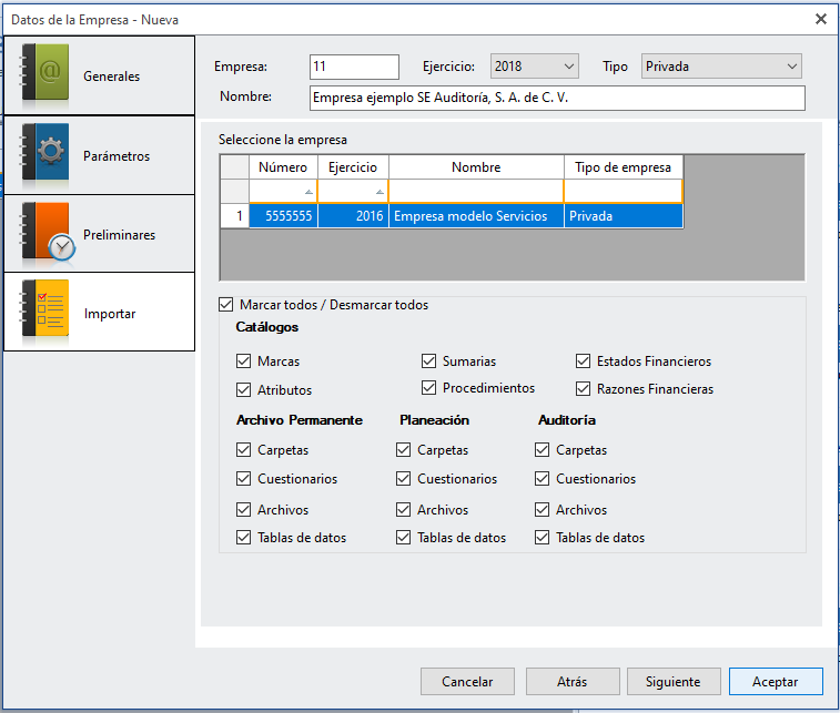En "Importar", deberás seleccionar la empresa modelo o plantilla, en caso de tenerla . Si no cuentas con una empresa modelo o plantilla, al crear la empresa el sistema subirá la estructura que tiene por default. Da clic en "Aceptar" para crear la empresa.
