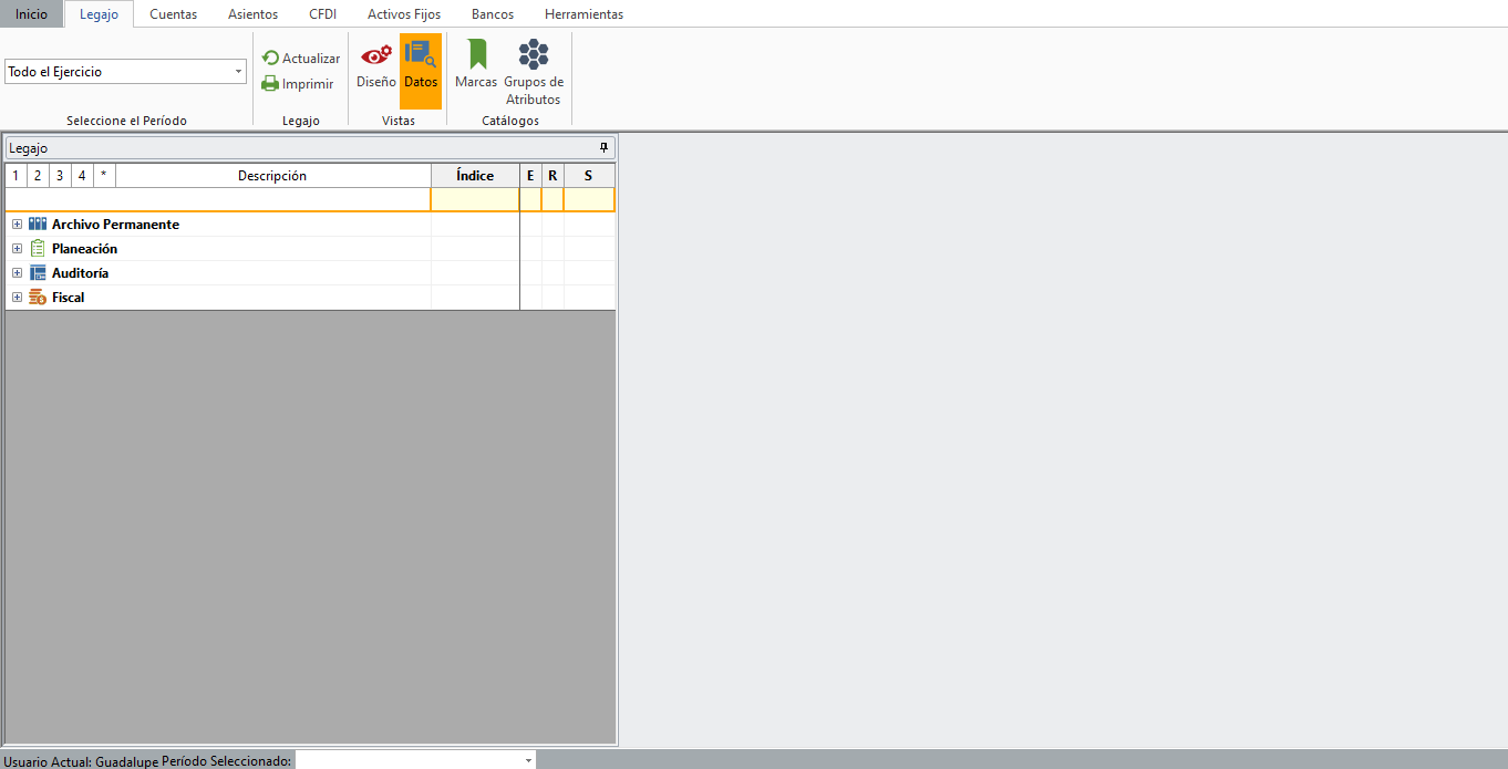 Al entrar a la empresa observarás las pestañas: "Legajo", "Cuentas", "Asientos", "CFDI", "Activos fijos", "Bancos" y "Herramientas".