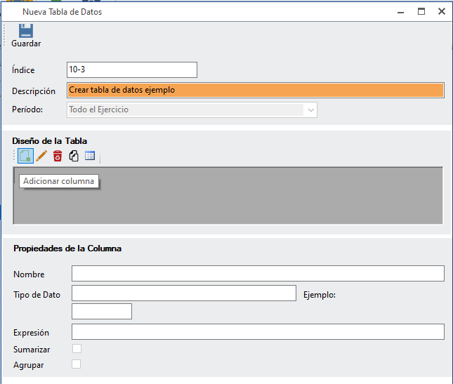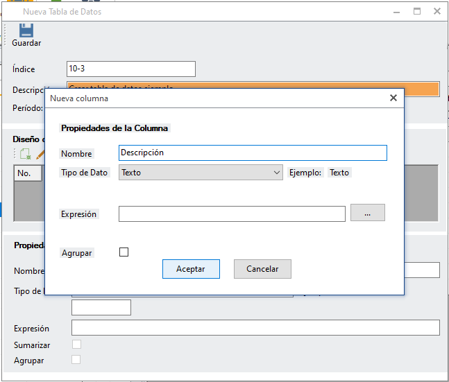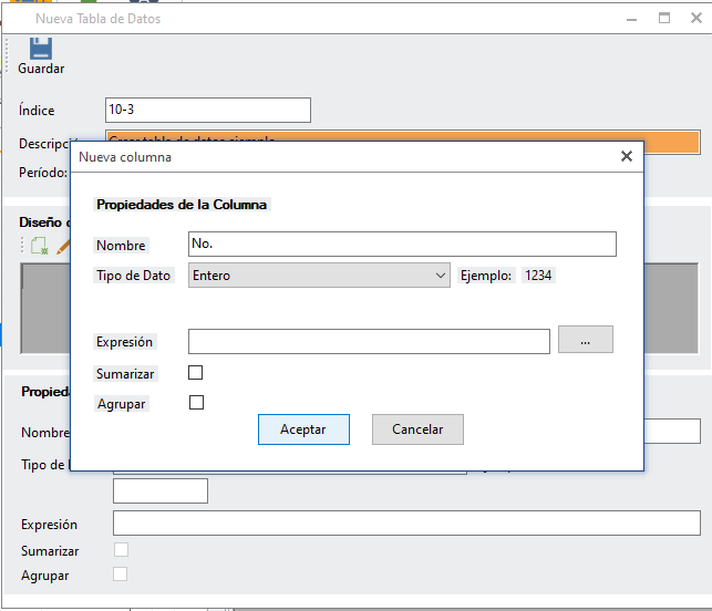Para comenzar a crear las columnas da un clic en "Adicionar columna". Ten en cuenta que deberás colocar el tipo de dato que necesites en cada columnas que agregues. En el ejemplo se muestra la columna "No.", el tipo de dato es "Entero". La expresión no aplicará. No se considera que sumarice la columna. Da clic en "Aceptar" para guardar los datos de la columna.