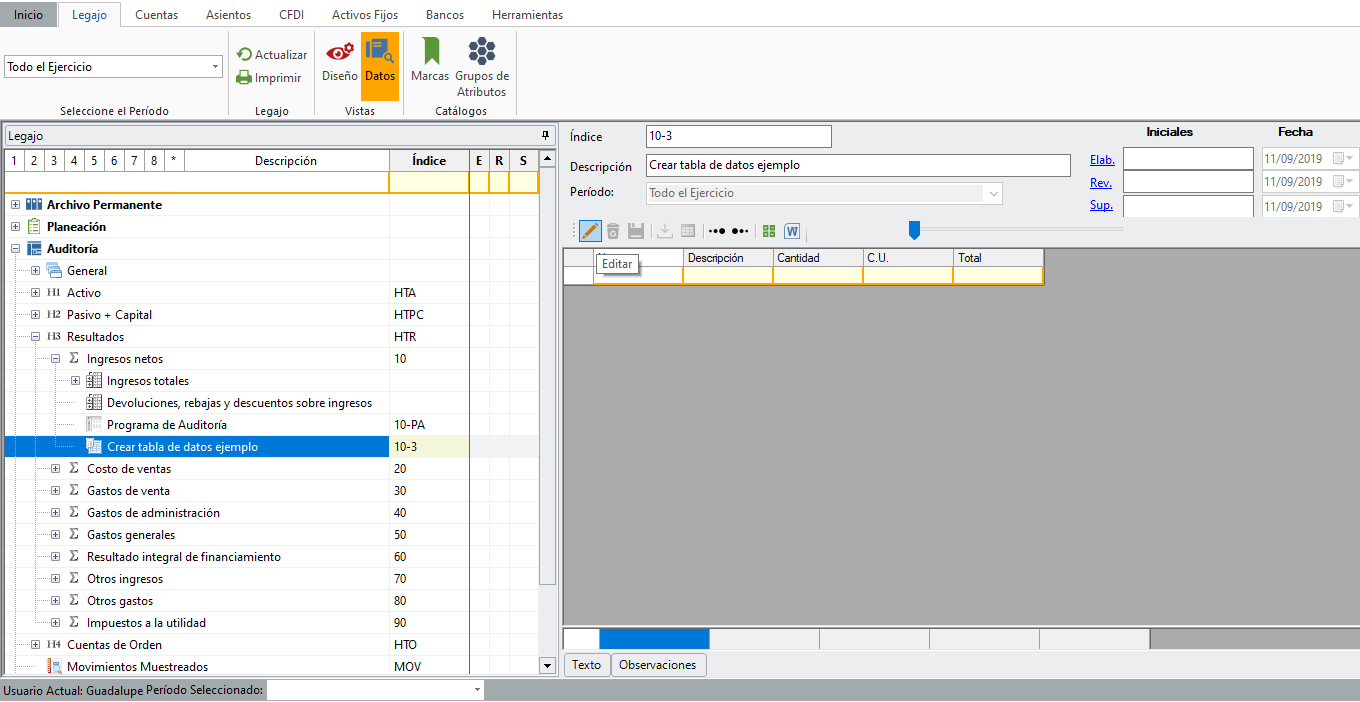 Presenta la tabla con sus columnas configuradas. Para comenzar a capturar en la tabla da clic en "Editar".