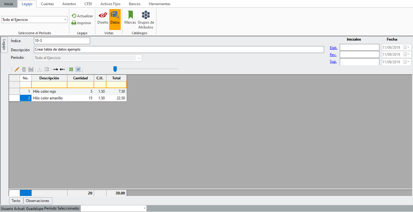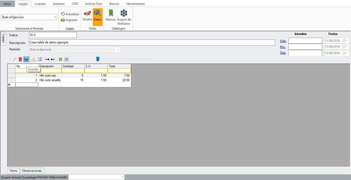 Se habilita la tabla para comenzar a capturar los renglones. Da clic sobre el elemento que vas a capturar para iniciar el ingreso de información. Al finalizar da clic en "Guardar" para grabar los datos capturados.