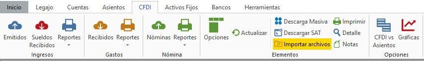 Dentro de la pestaña "CFDI", da clic sobre cualquiera de los apartados de ingresos, gastos o nómina. A continuación da un clic en el botón "Importar CFDI's", que se encuentra en el apartado "Elementos".