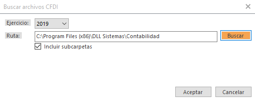 En la siguiente ventana deberás indicar el ejercicio a importar, la ruta donde se encuentran los archivos y además indicar si deberá incluir subcarpetas en la búsqueda de XML. No necesitas separar las facturas por tipo, es decir por ingresos, egresos y nómina, el sistema puede identificar a qué apartado deberá mandar cada una de las facturas. Da clic en "Buscar" para indicar la ubicación los archivos.