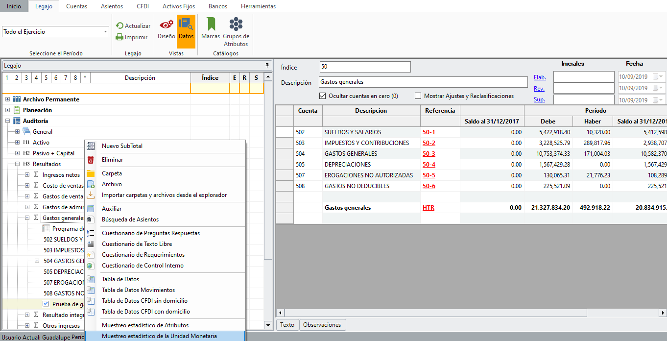 Para realizar el muestreo de unidad monetaria es necesario tener en una tabla de datos con la información que se desea muestrear. A continuación, se deberá seleccionar el lugar dónde se desea colocar el muestreo. Da clic con el botón derecho del mouse y seleccionar de la lista "Muestreo estadístico de la Unidad Monetaria".