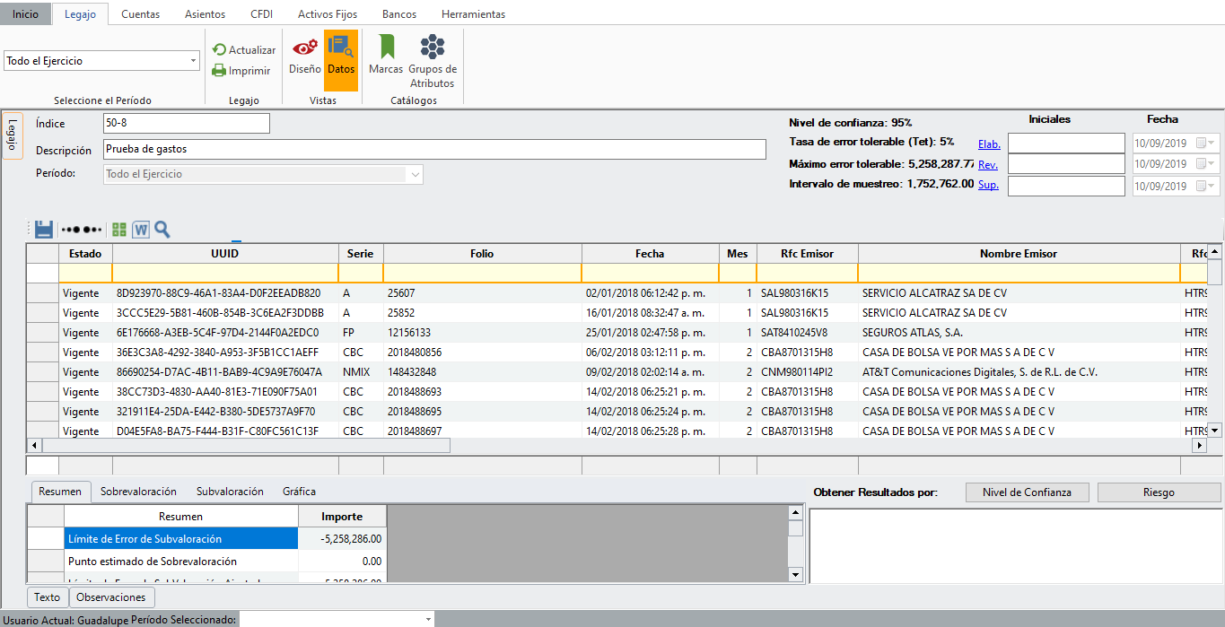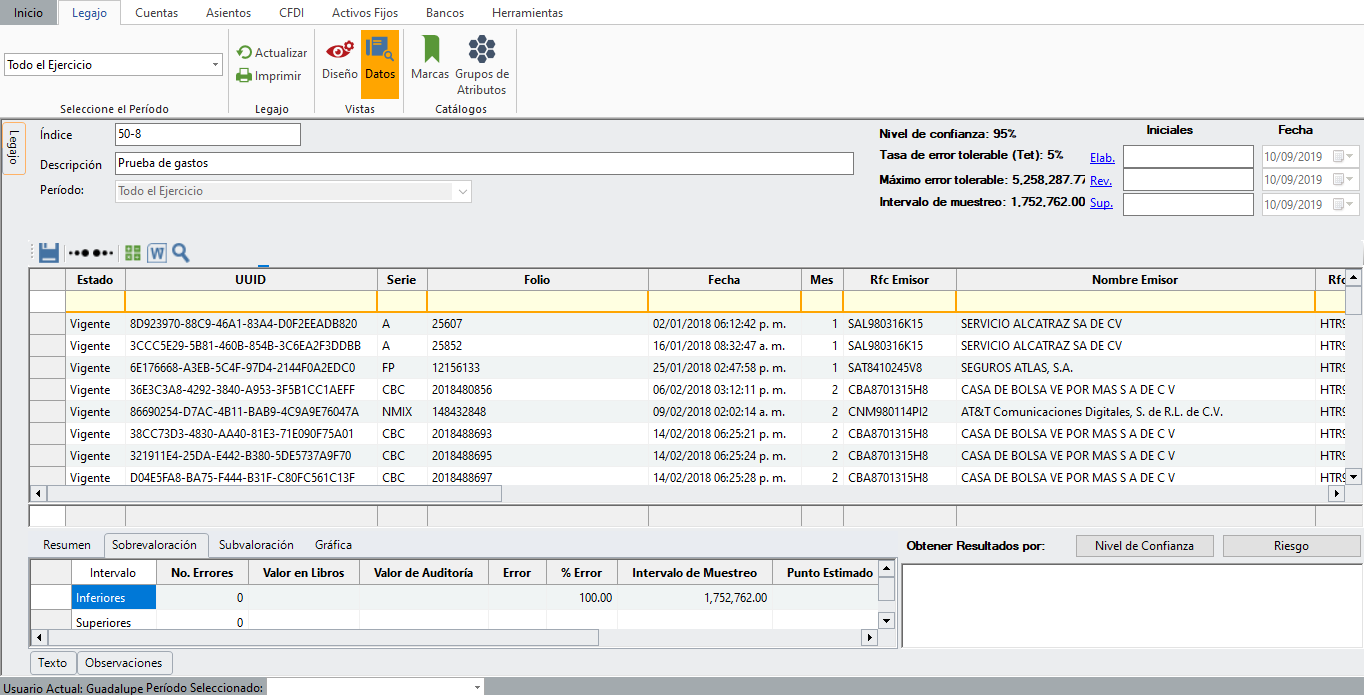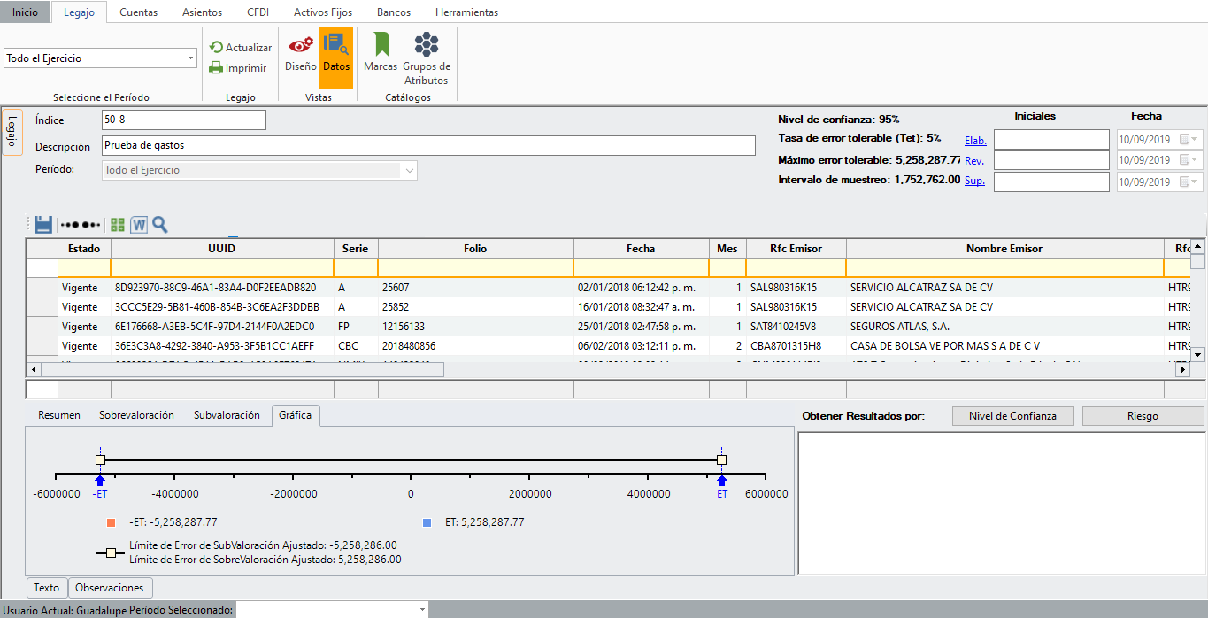 En “Error esperado” “Valor en errores” se deberá indicar el importe en errores permitidos o en su caso el porcentaje que se desee utilizar en “Tasa de error (Tee).
