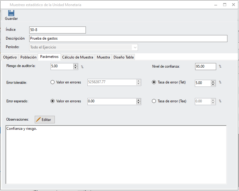 En “Parámetros” se deberá indicar el “Riesgo de auditoría”, “Error tolerable” y el “Error esperado”.