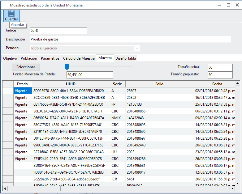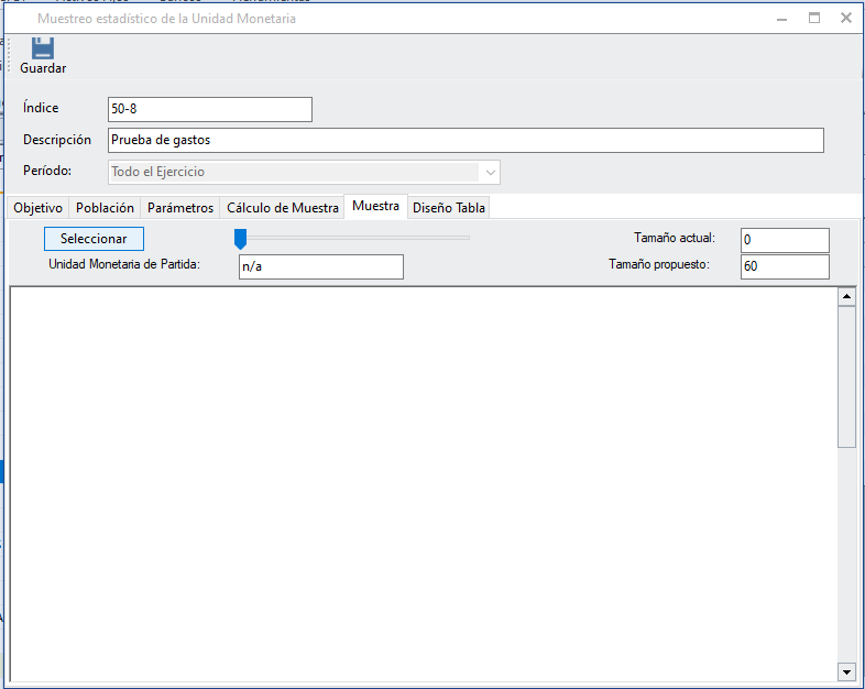 En “Muestra” da un clic en “Seleccionar” para que el sistema vaya a la población y tome las partidas que serán muestreadas.