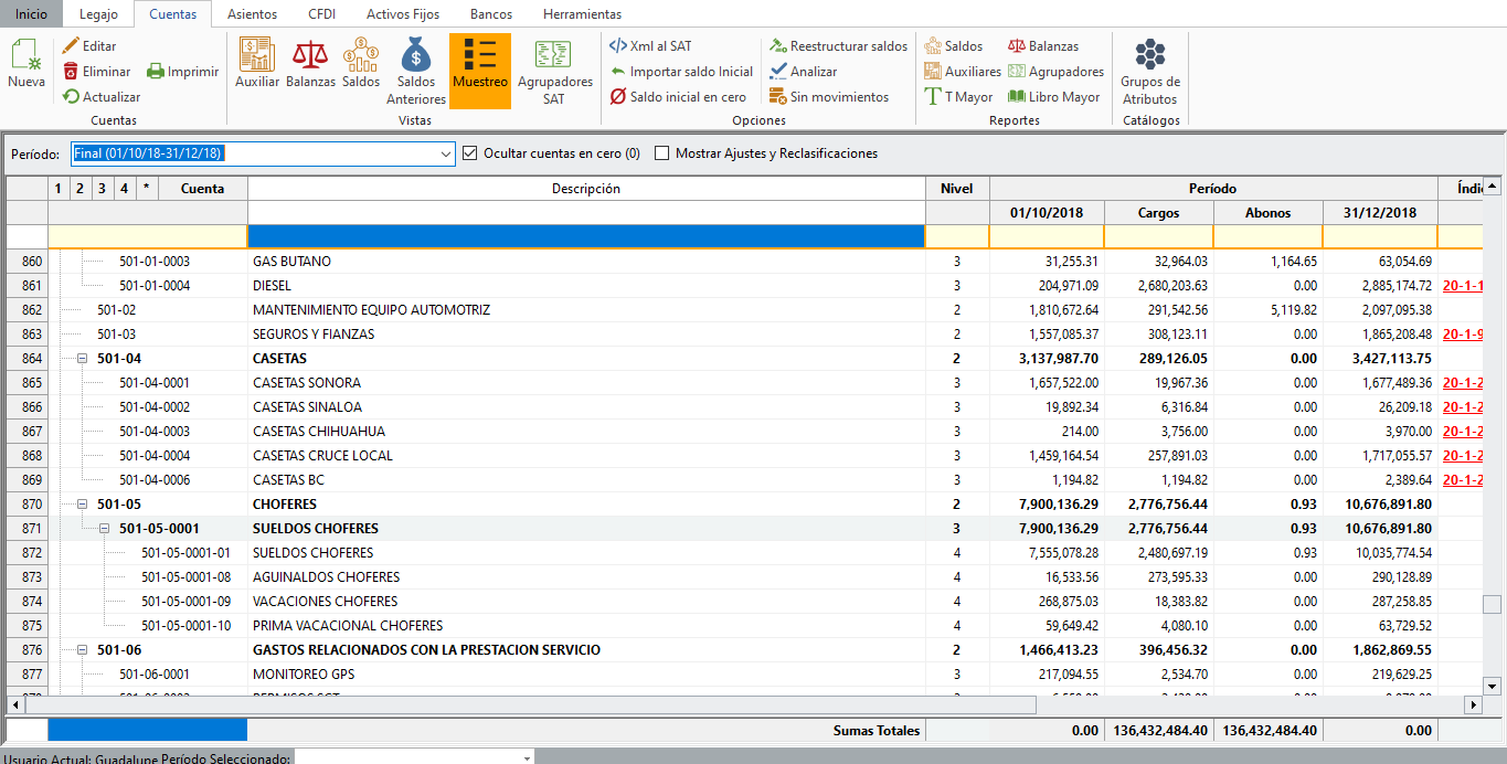 Al terminar el proceso se mostrará un "Si" en la columna "Muestreada", lo que indica que fue muestreada en este periodo la cuenta.