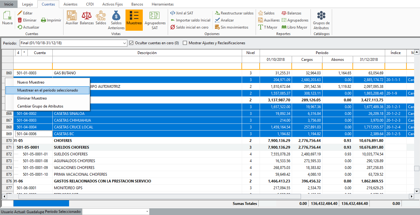 Selecciona la cuenta o cuentas que serán muestreadas, da clic con el botón derecho del mouse y elige "Muestrear en el periodo seleccionado". Da clic en "Siguiente".