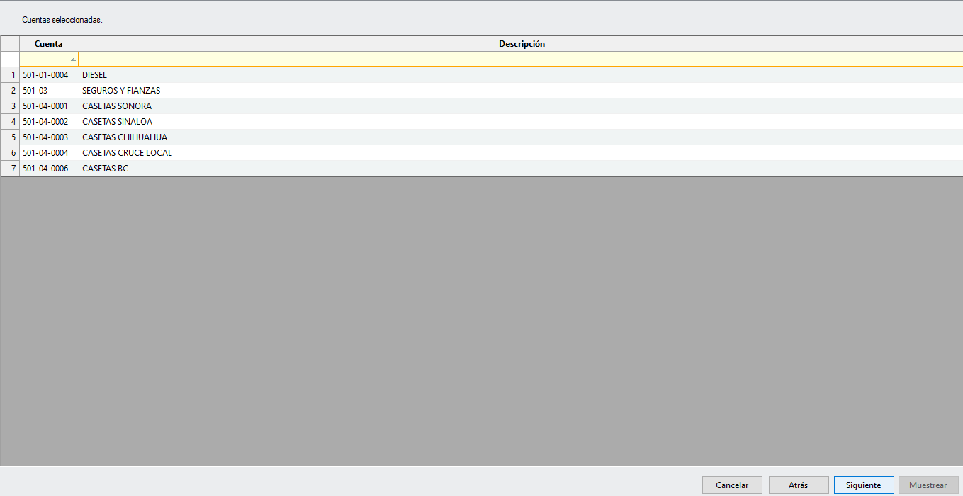 Al dar clic muestra la siguiente ventana, indicando las cuentas que serán muestreadas.