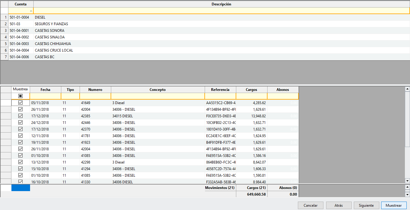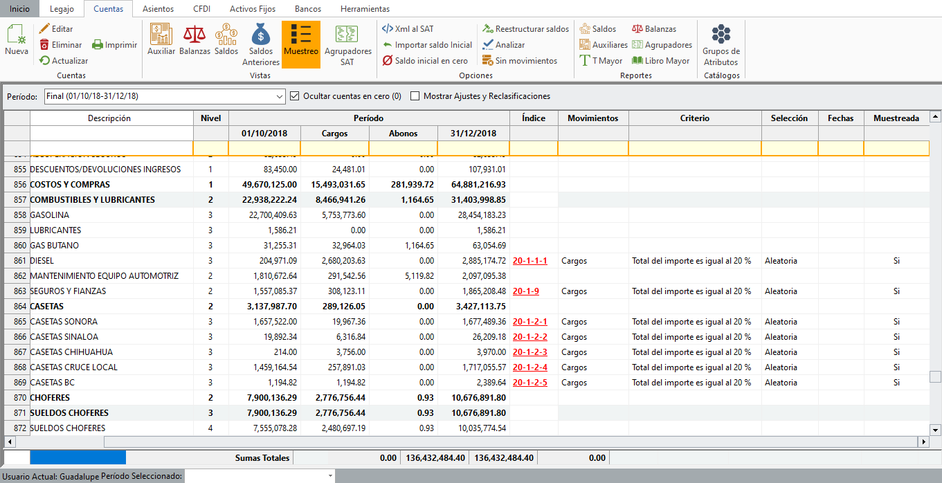 Se presentará la cuenta o cuentas que hayan sido seleccionadas para el muestreo. Además se mostrarán los movimientos que serán parte de la muestra. Da clic en "Muestrear".