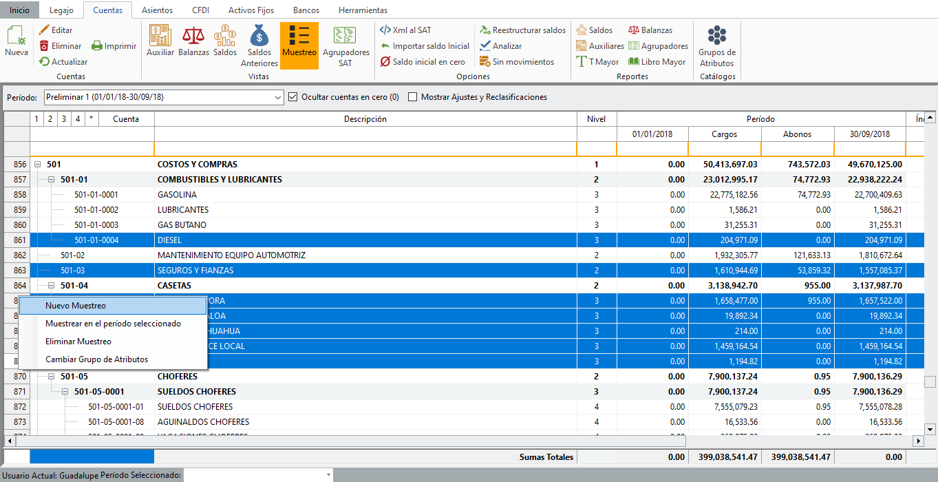 Selecciona la cuenta o cuentas que serán muestreadas, da clic con el botón derecho del mouse y elige "Nuevo Muestreo".