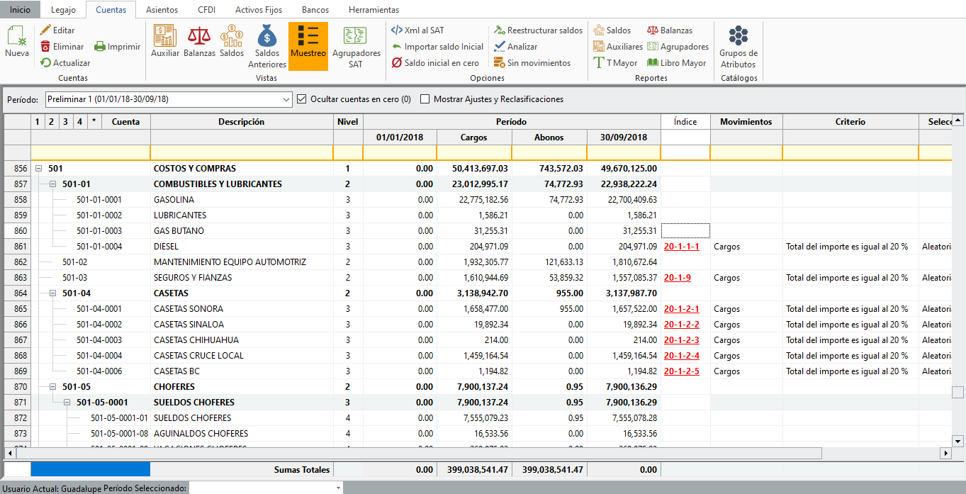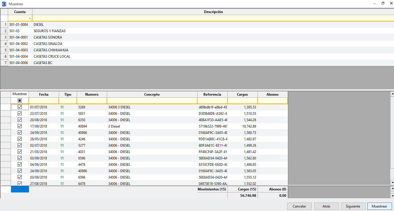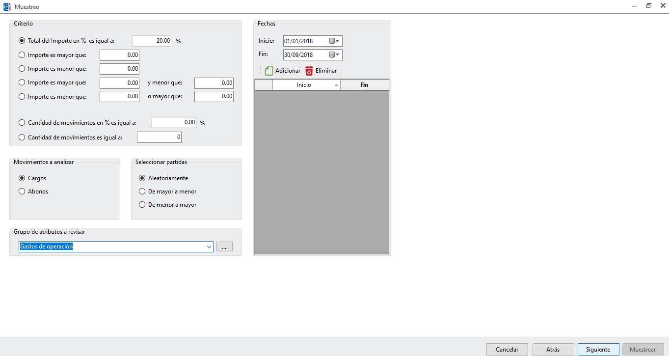 Revisa que las cuentas a muestrear sean las correctas, da clic en “Siguiente”. Presentará la ventana con los diferentes criterios de selección.