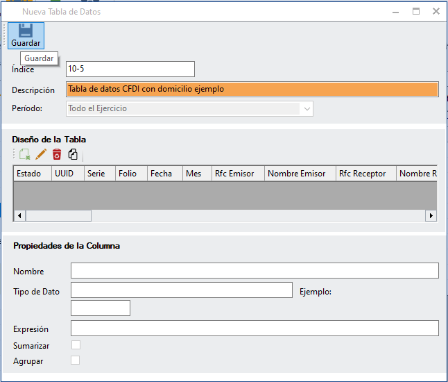 Se presenta la siguiente pantalla. Captura la información que necesites. La estructura de esta tabla de datos no puede ser modificada, se podrá agregar más columnas y editarlas, pero las que tiene por default no se permiten editar. Da clic en “Guardar” para crear la tabla de datos con estructura para XML.