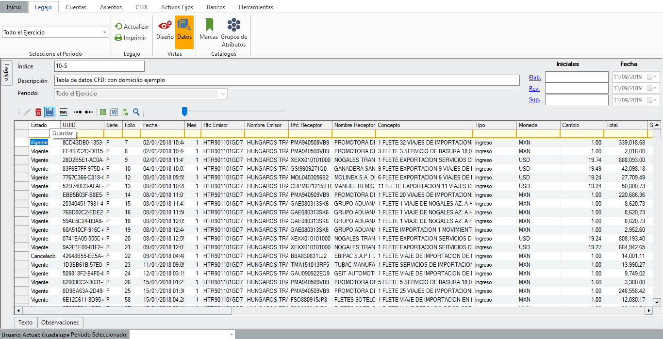 La información es importada a la tabla de datos. Es importante dar clic “Guardar” al terminar de importar.